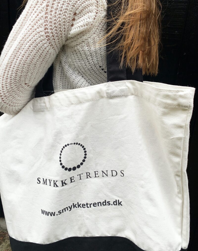 Klassisk bag i bomuld, to farvet deluxe – 49 x 38 x 15 cm hvid/sort: forside med påtrykt Smykketrends logo.