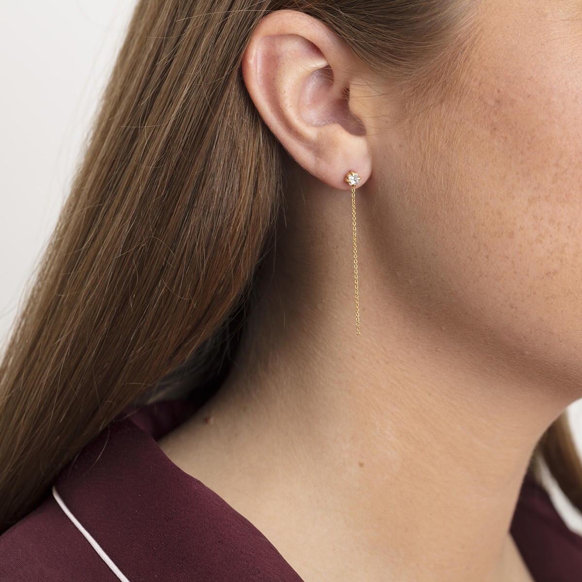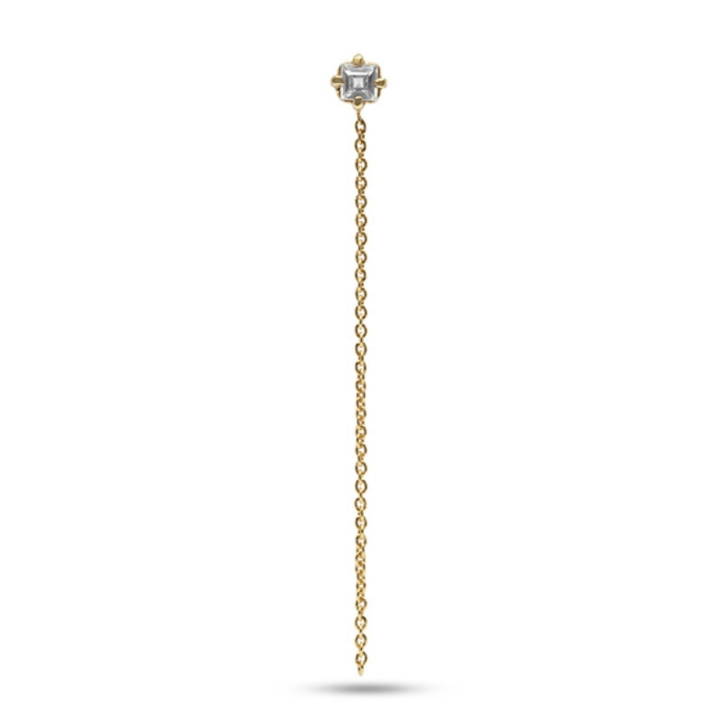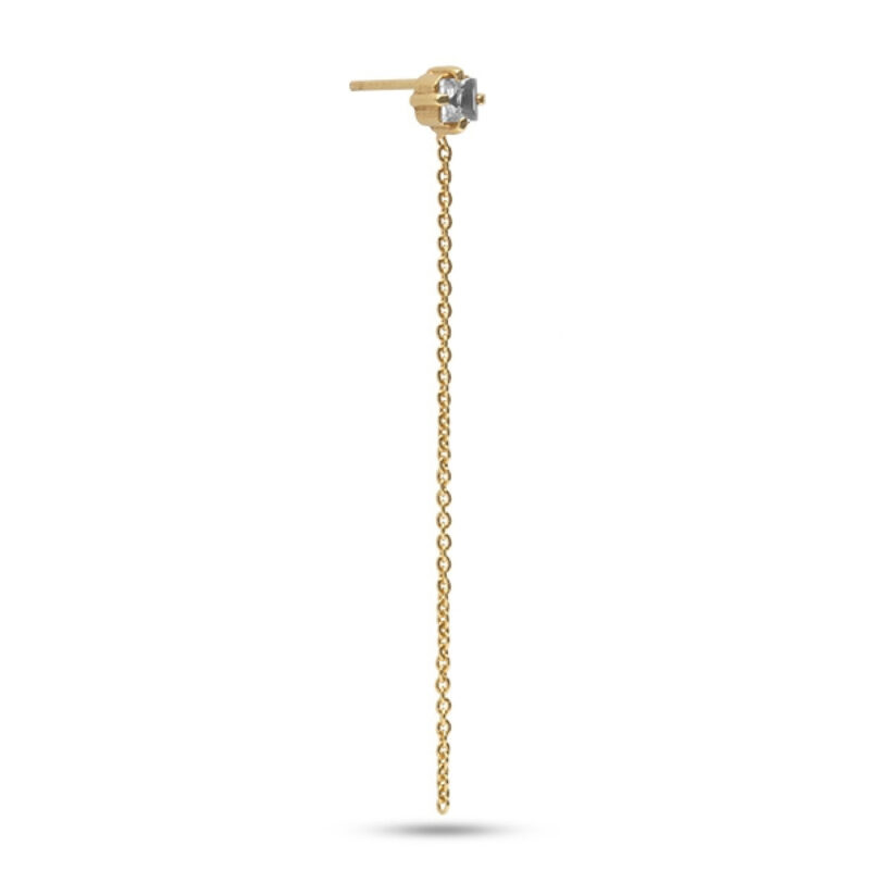 Enkelt ørering i guldbelagt sterling sølv med fin kæde. Øreringen er sat med en kvadratisk slebet zirconia i en fin grabbefatning. Brug øreringen med de andre øreringe for et smukt og asymmetrisk udtryk.