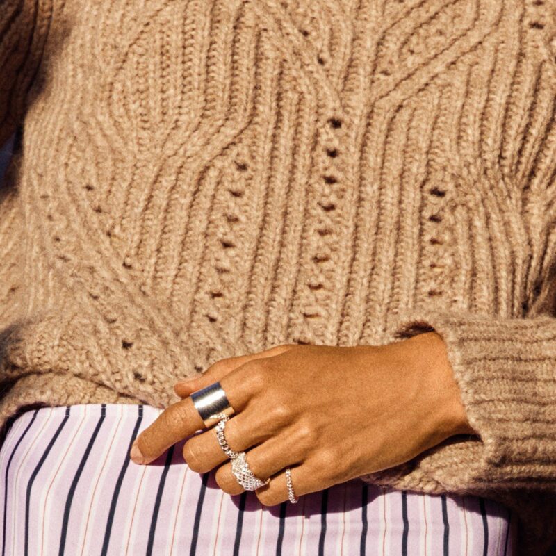 En bred sølvbelagt ring med et smukt hulmønster. Begge kanter på ringen har fine afrundede tunger. Dette skaber sammen med hulmønsteret en illusion om en smuk blød blonde, der omkranser din finger. En lækker, unik ring med feminine detaljer og et skønt eksotisk strejf. Ringen er smuk alene, men kan også kombineres med andre sølv ringe.